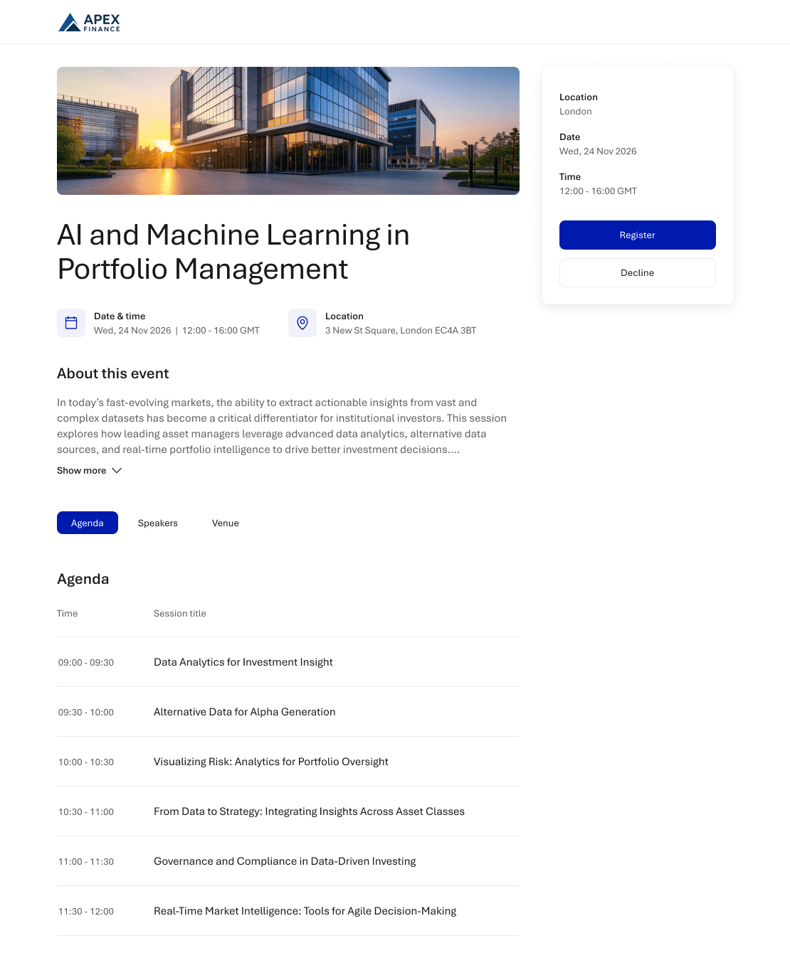 An event app enabling finance companies to track and manage attendance for upcoming events.